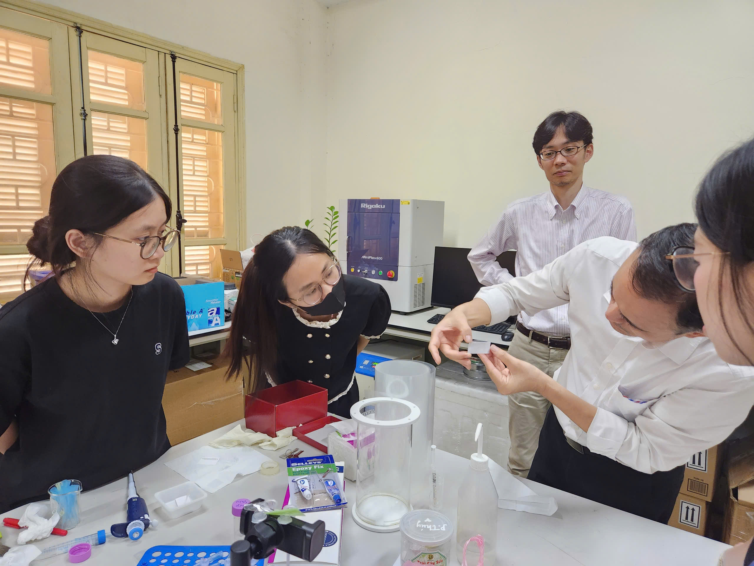 Since July 2025, Output 1 experiments have been accelerated with the support of student manpower. Three students are currently engaged in the experiments, including Ms. Tran Kim Chi, who will join Prof. Mawatari’s laboratory as a master’s student this September. On this occasion, Mr. Tazawa (Waseda University) and Dr. Hachiya (DKK-TOA), together with Associate prof. Trinh from HUS, provided guidance to the students.
